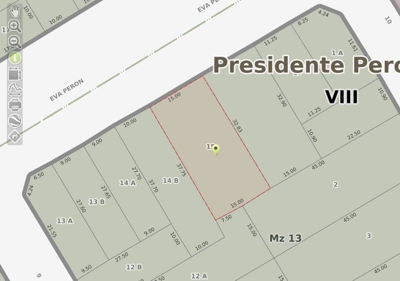 La misma se encuentra ubicada en Av Eva Duarte de Perón de la localidad de Guernica, a tres cuadras del paso a nivel. Sus medidas son 15 metros de frente por 33 de largo lo que da una superficie de 495 M2 ideal para la construcción de locales comerciales y departamentos ya que sobre dicha avenida se puede construir hasta 6 pisos.
